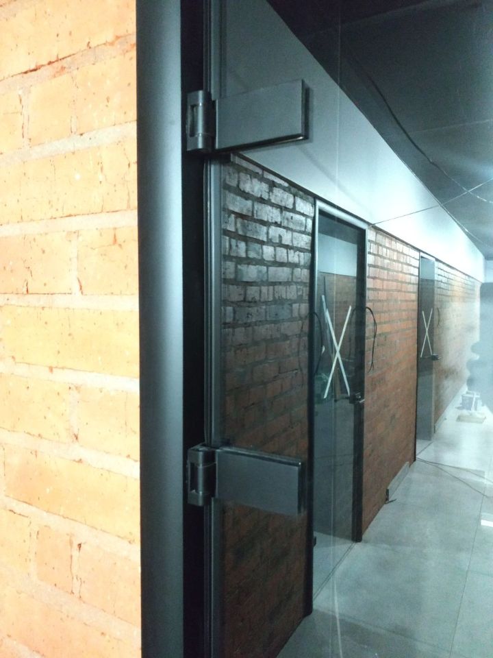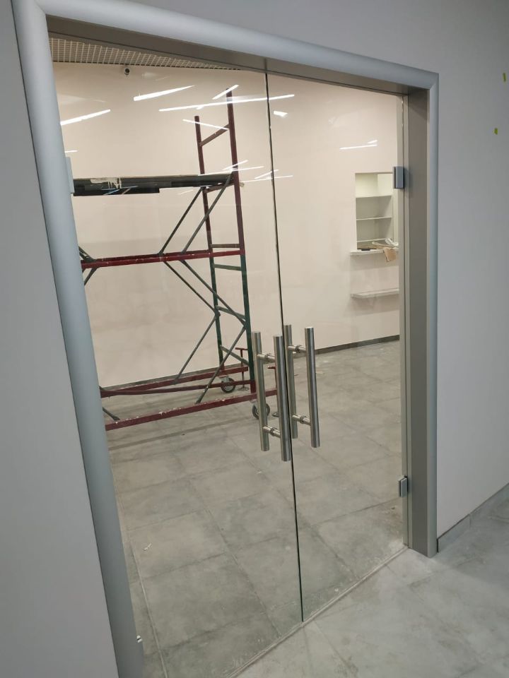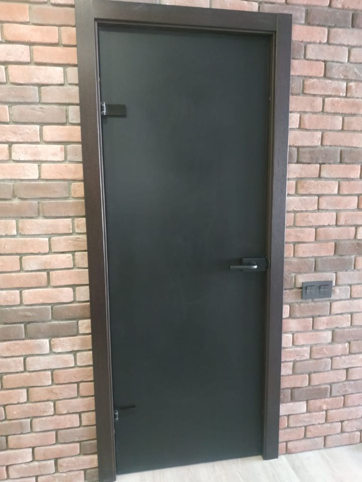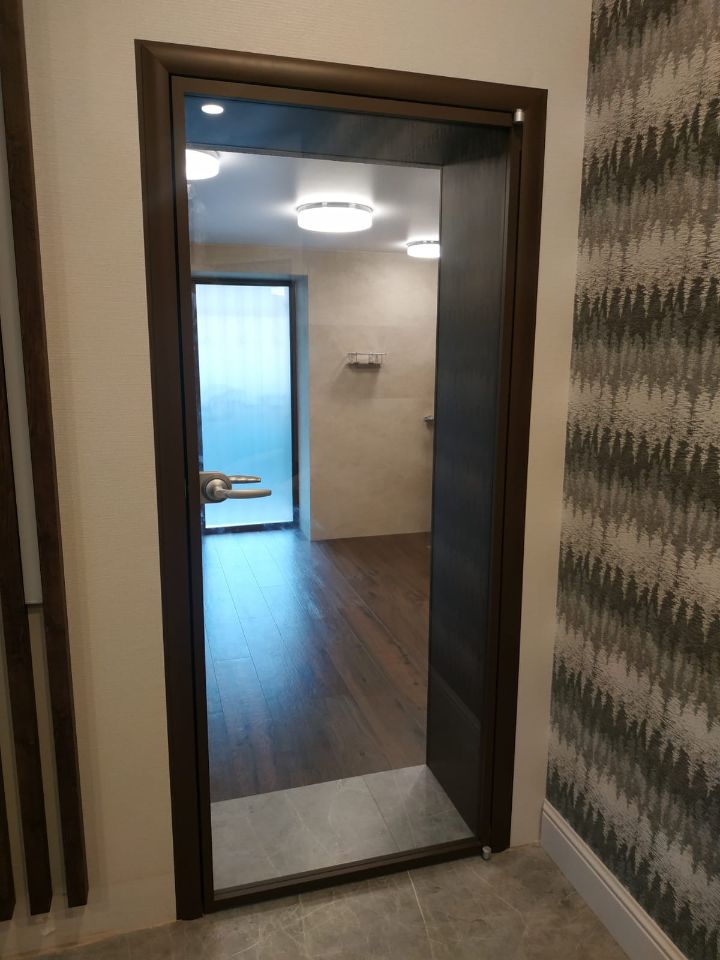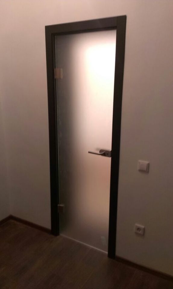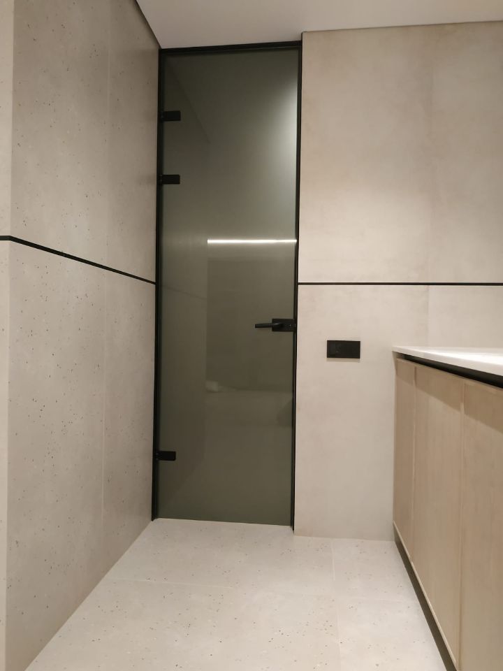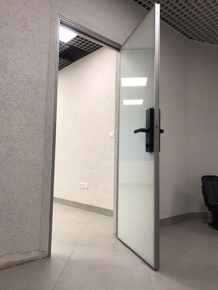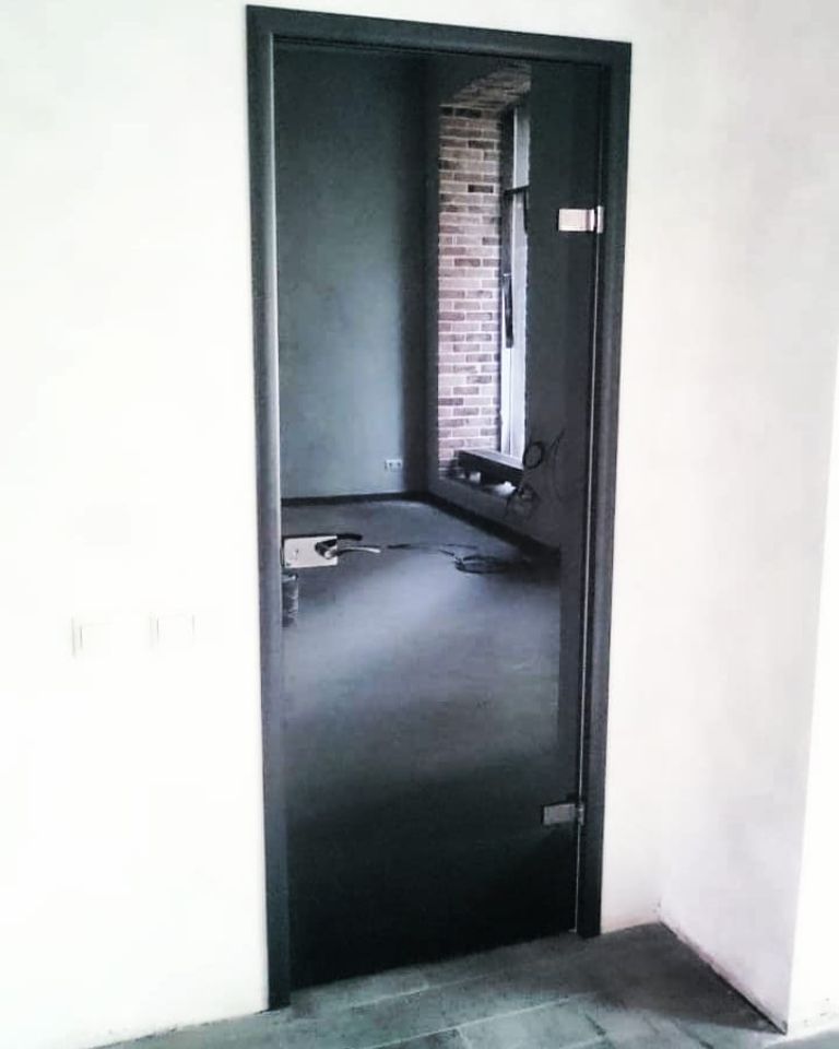 Стеклянная дверь - полотно из закаленного безопасного стекла толщиной 8 мм и элегантный, миниатюрный Z или L - образный короб из анодированного алюминия. Алюминиевая дверная коробка устанавливается в подготовленный чистовой проем вплотную к подготовленному основанию.