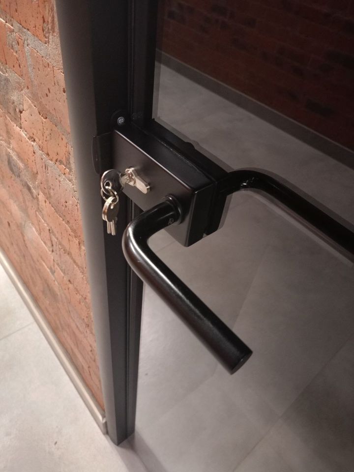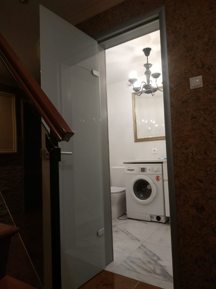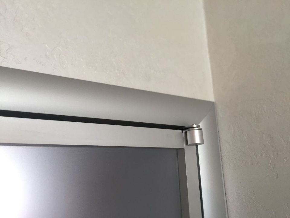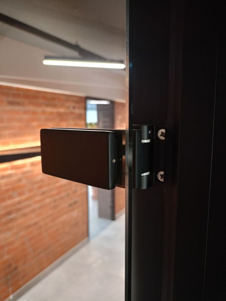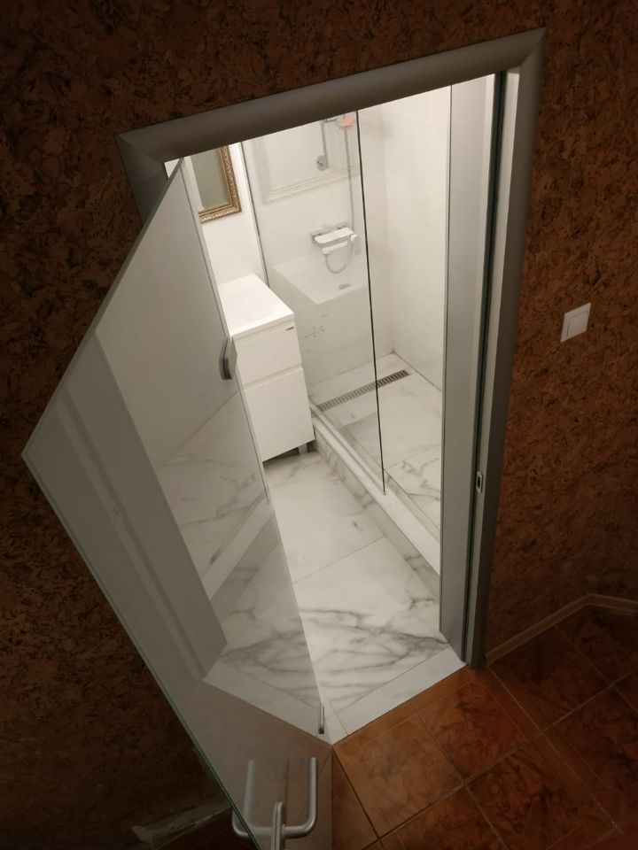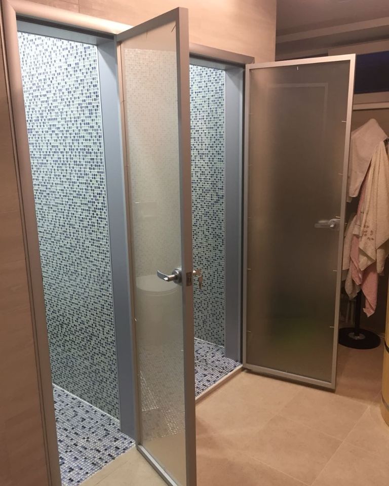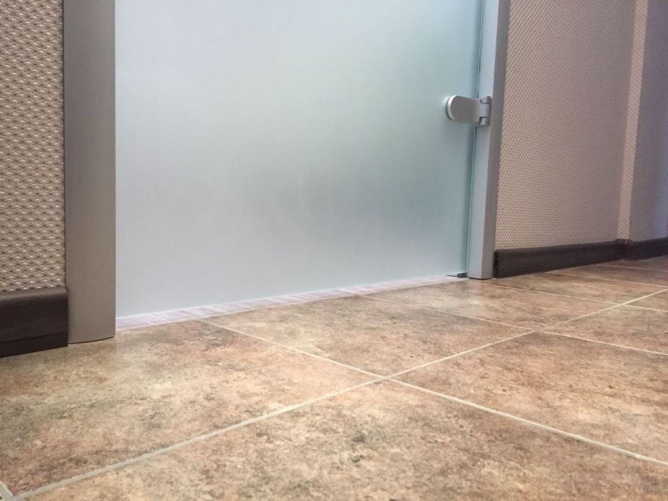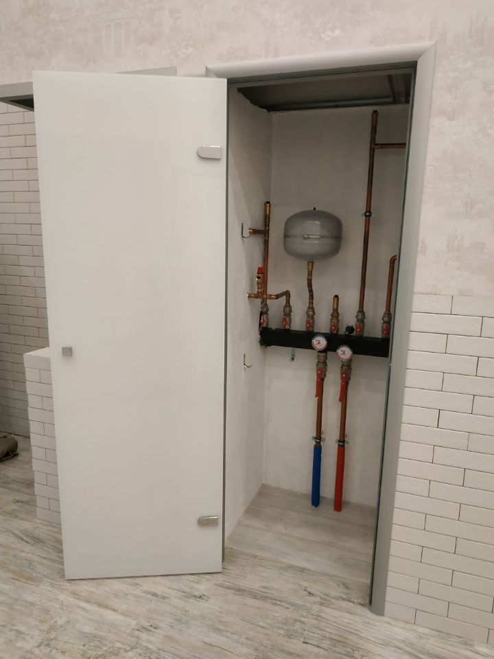 Стеклянная дверь - полотно из закаленного безопасного стекла толщиной 8 мм и элегантный, миниатюрный Z или L - образный короб из анодированного алюминия. Алюминиевая дверная коробка устанавливается в подготовленный чистовой проем вплотную к подготовленному основанию.