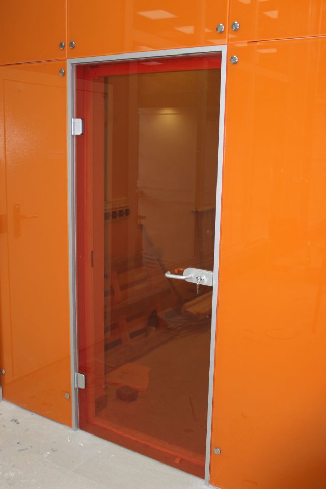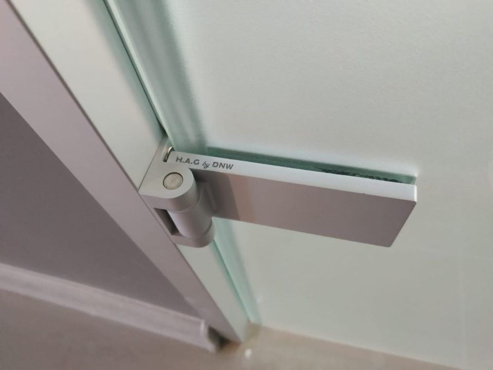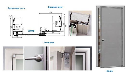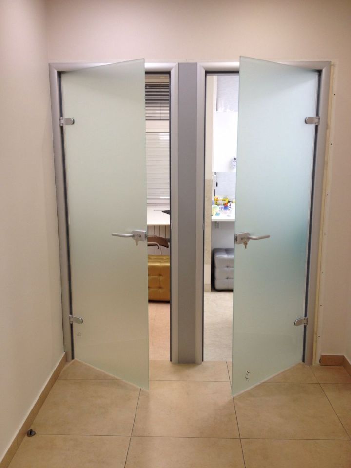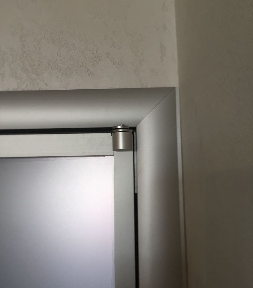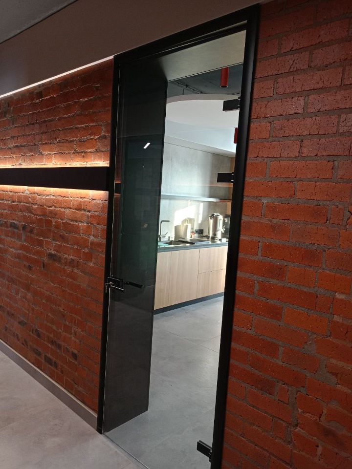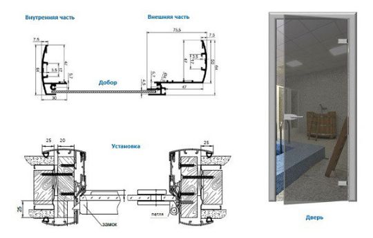 Стеклянная дверь - полотно из закаленного безопасного стекла толщиной 8 мм и телескопический короб из анодированного алюминия. Система позволяет встраивать коробки в проемы любой толщины, начиная с 75 мм. Коробка двери состоит из двух частей: внешней, устанавливаемой в проем со стороны открывания двери, и внутренней, устанавливаемой в проем с противоположной стороны стены