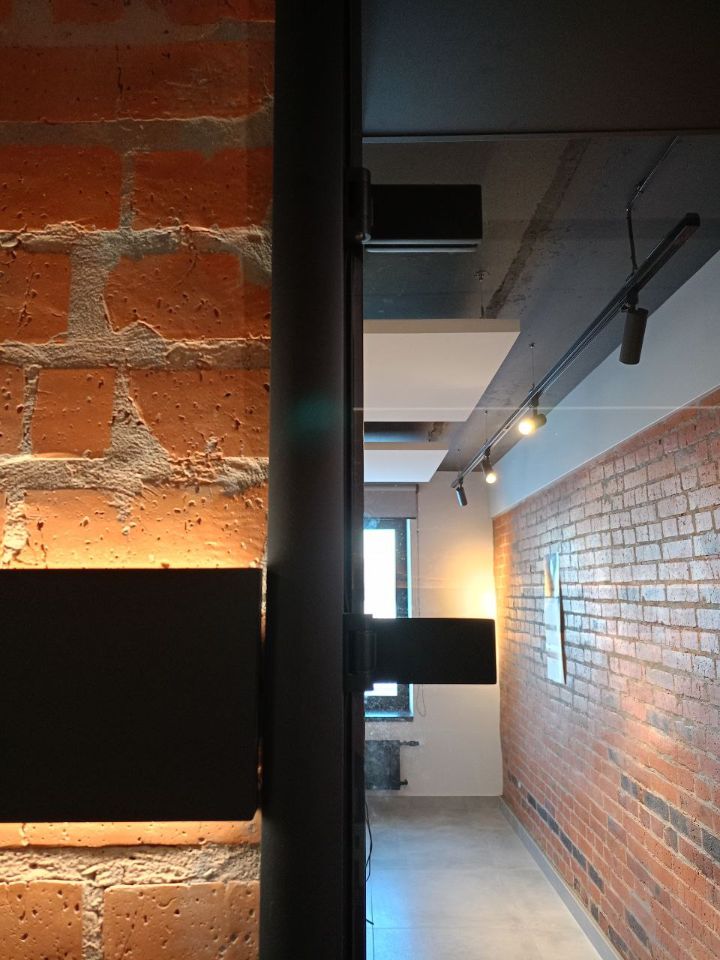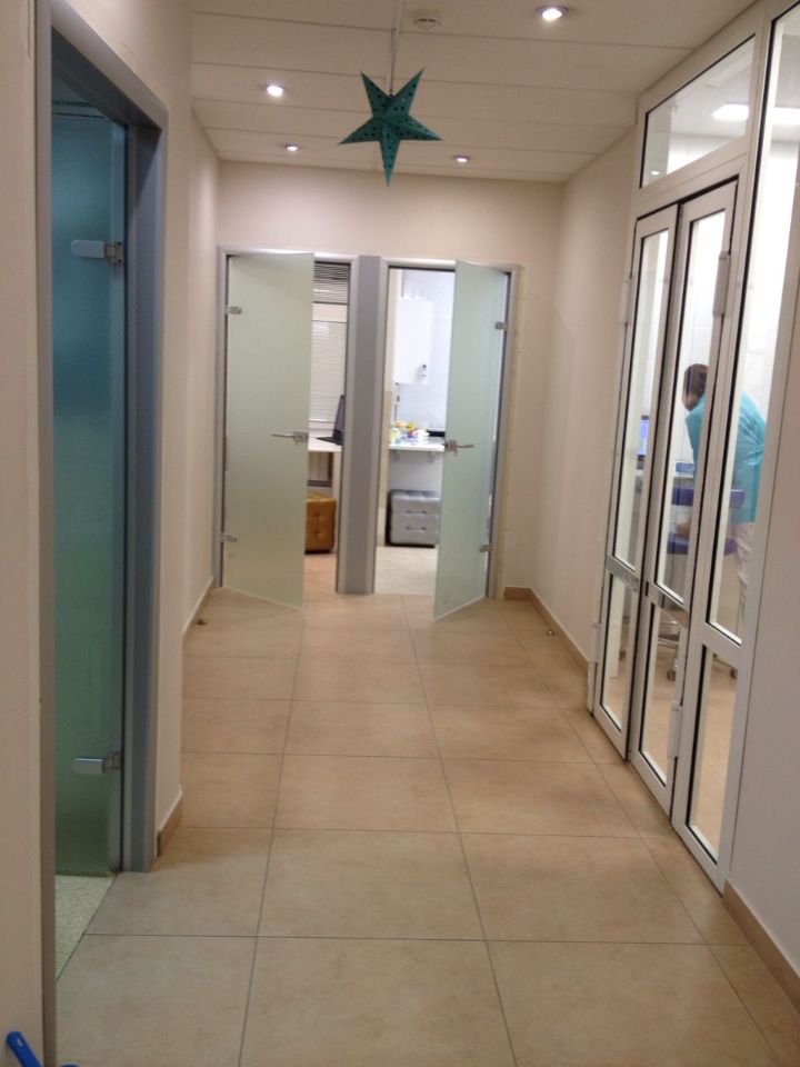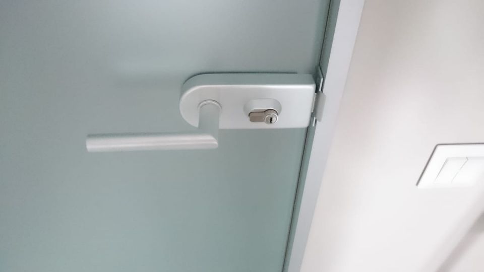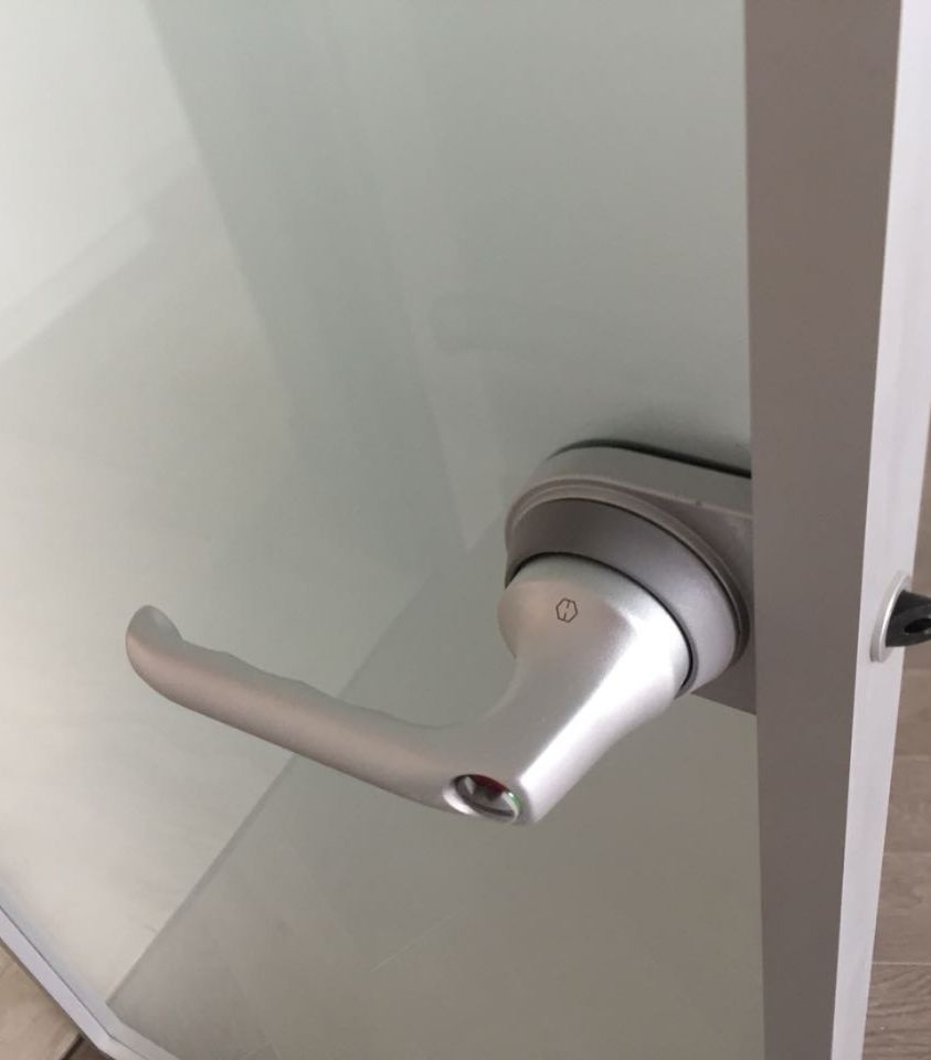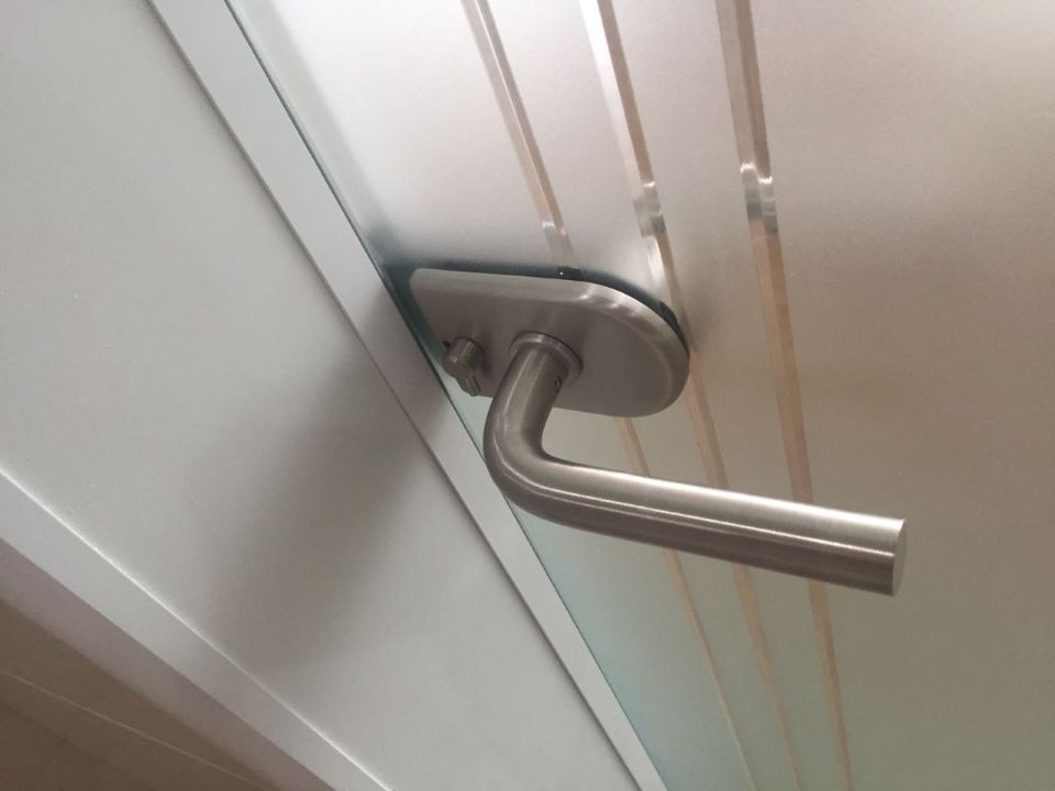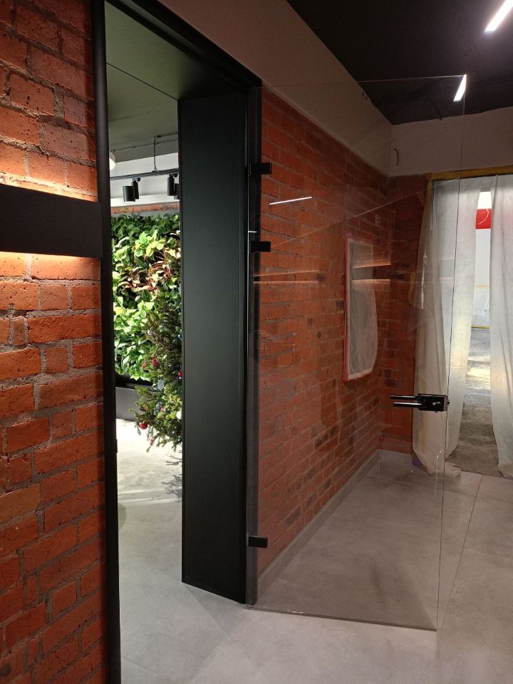 Стеклянная дверь - полотно из закаленного безопасного стекла толщиной 8 мм и телескопический короб из анодированного алюминия. Система позволяет встраивать коробки в проемы любой толщины, начиная с 75 мм. Коробка двери состоит из двух частей: внешней, устанавливаемой в проем со стороны открывания двери, и внутренней, устанавливаемой в проем с противоположной стороны стены