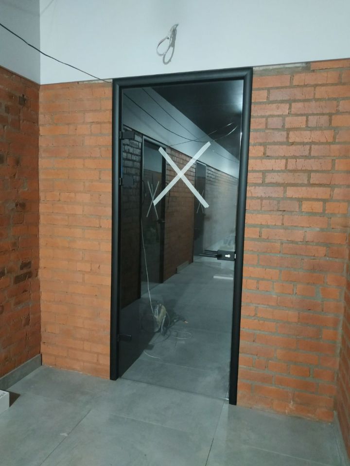 Стеклянная дверь в алюминиевой рамке - полотно из закаленного безопасного стекла толщиной 5мм в раме и телескопическая коробка из анодированного алюминия.