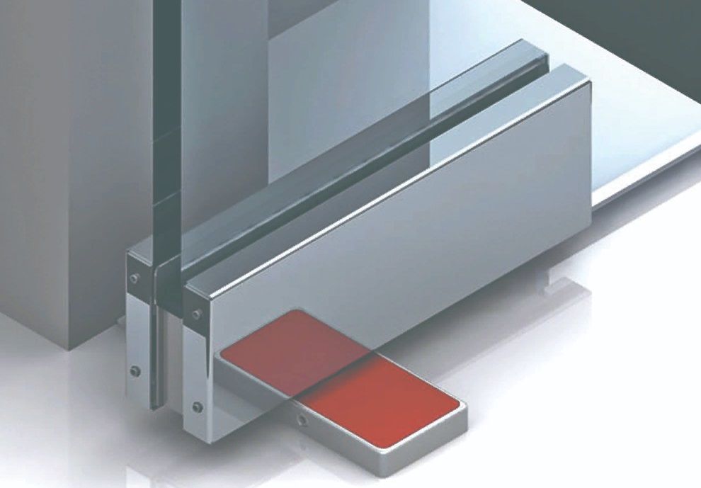 Установочный профиль или зажимной профиль в данном проекте устанавливается на поверхность основания. Маятниковые двери установлены на необходимую, проектную высоту в сочетании со стеклянной фрамугой. Для установки двери с фрамугой используются специальные зажимные фитинги